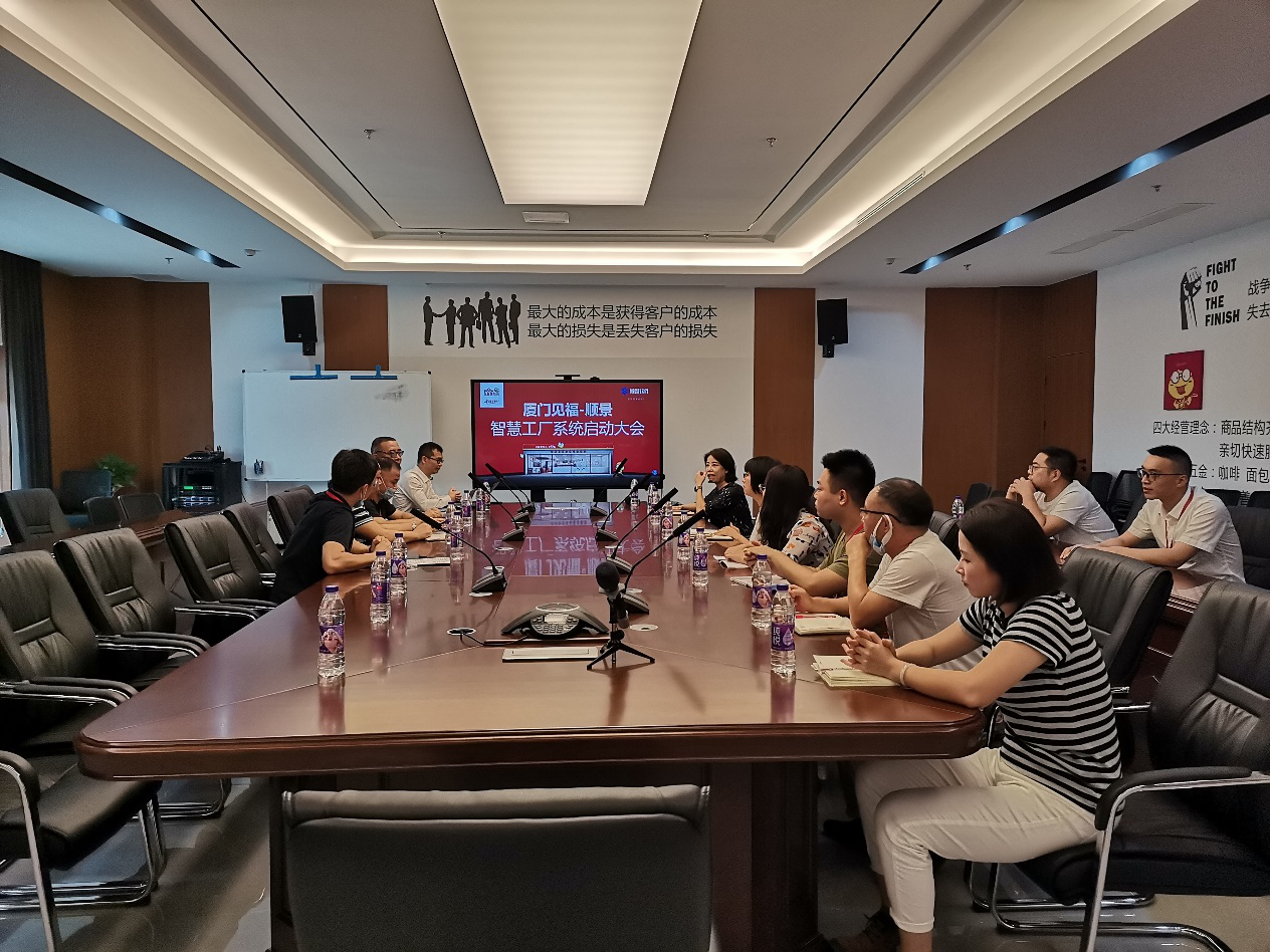 厦门见福连锁管理有限公司携手顺景软件智造升级,2020年8月10日,双方共同举行了智能智造项目启动大会。见福副董事长于兴军、烘焙厂总经理杨伟艺、特助周志强及各部门主管,顺景软件李江谋,项目经理覃君毅及双方项目实施团队成员共同出席了本次启动会。