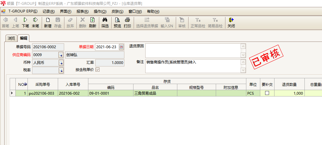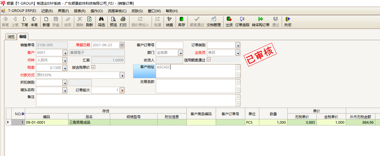 5.现在顺景ERP内就会自动在A公司库内生成一张采购订单。