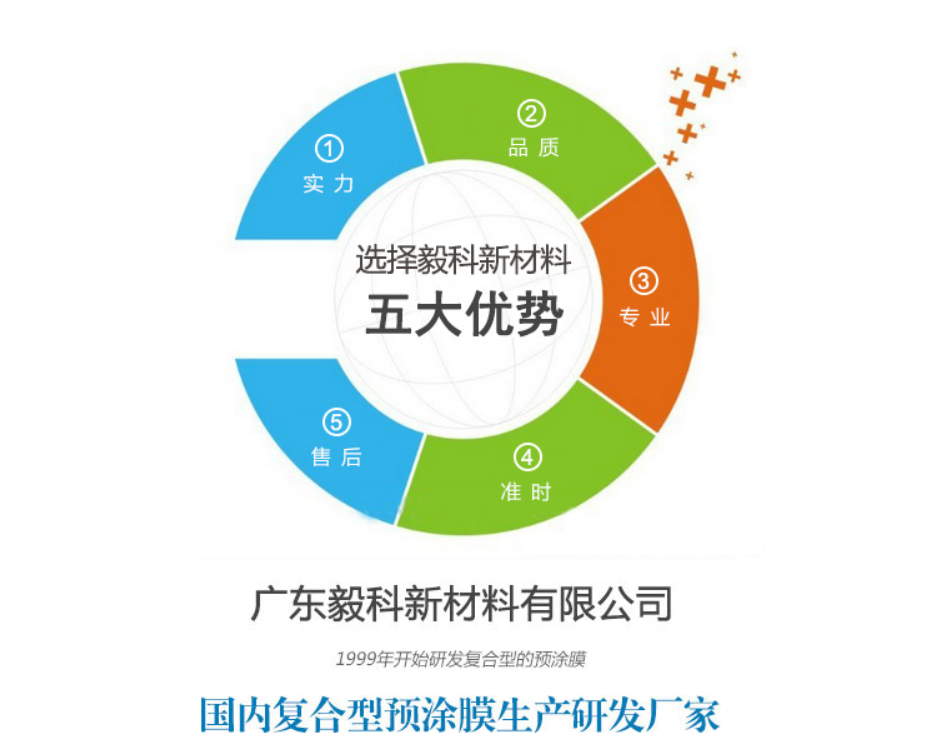 广东毅科新材料有限公司从1999年开始研发复合型的预涂膜,也是国内复合型预涂膜生产研发厂家,十几年来我们不断努力改进产品,优化产品性能,制造多元化复合材料产品。公司主营产品BOPP预涂膜、PET预涂膜、数码印刷预涂膜 ,广告喷绘热裱膜,PET地暖复合材料,产品应用于包装印刷覆膜、办公用品覆膜,广告热裱覆膜、建筑复合材料、光学复合材料等领域 。公司已通过ISO09001:2008质量管理体系认证、绿色印刷环保标志认证、国家高新技术企业认定;EVA型预涂膜行业标准制定单位等荣誉,先进的ERP系统管理,注重知识产权的开发和应用,授权实用新型专利有多项,申请发明专利多项;还拥有一支优秀的研发团队,专业知识和技术经验丰富,能为产品的质量提供强而有力的技术支撑。有良好的企业氛围和浓厚的米兰体育在线登录入口,我司运用5S的管理营造一目了然的工作环境,养成良好的工作习惯,提升员工水平,一起营造一个和谐美好的工作环境,从而达到规范化管理。 感恩,价值,共进,分享是我们的理念,“双赢”是我们的经营方针,我们将进一步完善企业质量管理体制,为客户提供更优质的产品和服务。